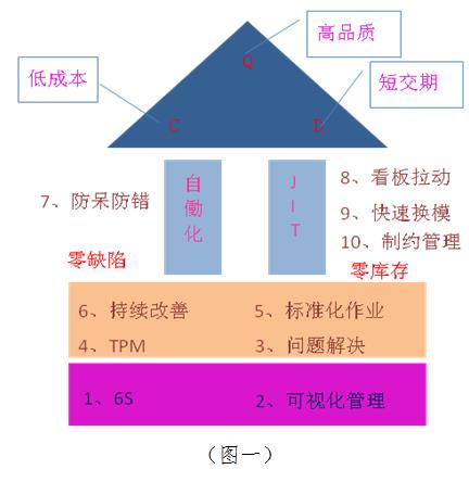 過去我們對TPS的系統(tǒng)認識,主要是從精益屋(圖一)里的所有工具知識開始,實施過程中我們也使用了很多的工具去解決現(xiàn)場問題,比如防呆防錯、快速換模等。但由于全員參與的氛圍不夠,而且每期項目結束后沒有形成長期的績效考核,導致經過一段時間后,部分改善后的指標又出現(xiàn)反彈。為了建立一套更符合我們匯美實業(yè)的TPS系統(tǒng)推行方法,使全員再好地參與到TPS當中來,形成一致的改善方法和習慣,從而形成具有匯美特色的精益生產文化,我們再次與豐田企業(yè)文化進行了對比,從《大野耐一語錄》中再次找到了另一個精益屋(圖二)。