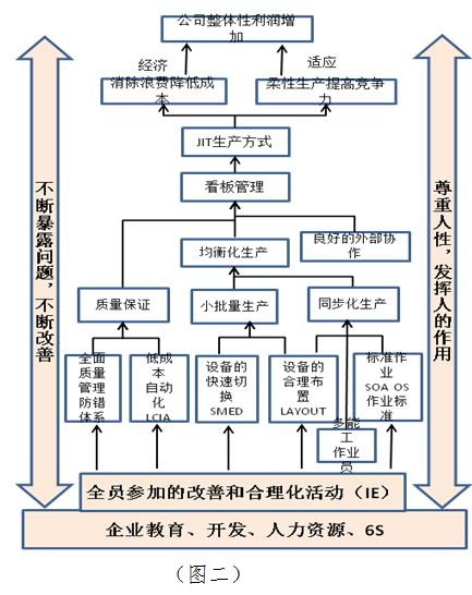 從圖中可以看出,與之前我們一直使用的精益屋(圖一)相比,新版精益屋內部總體的工具內容及推行思路大體相同,但是外面多了三個圍繞整個工具的內容。第一部分增加了企業(yè)教育、開發(fā)、人力資源,也就是說TPS要系統(tǒng)全面開展,首先必須要培養(yǎng)一批相應的專業(yè)人才,同時也要對全員進行普及性知識培訓,同時在推行過程中有相應的人力資源配套(比如績效、激勵等)。第二部分增加的是不斷暴露問題,不斷改善,這也是豐田方式的核心,通過系統(tǒng)方式對各種浪費問題不斷地暴露,并加以解決,達到無間斷生產的目標,從而實現(xiàn)高品質、低成本、短交期。第三個增加的是尊重人性、充分發(fā)揮人的作用,豐田生產方式的核心是不斷暴露問題并加以解決,人本身就不愿意把自身的問題和短板暴露出來,因此要想成功推行豐田生產方式,就得利用企業(yè)文化、機制來激勵并尊重員工,讓員工擁有戰(zhàn)勝自我的勇氣,把員工的潛能激發(fā)出來,最終實現(xiàn)企業(yè)和員工共同成長的目的。