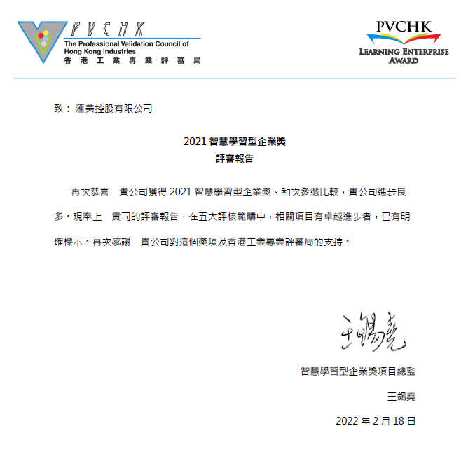 由香港工業(yè)專業(yè)評審局舉辦的“2021智慧學(xué)習(xí)型企業(yè)獎”的獲獎結(jié)果已經(jīng)出爐,今年共有34家企業(yè)成功通過復(fù)審,最終摘得“2021智慧學(xué)習(xí)型企業(yè)獎”的桂冠。其中,我公司匯美控股就在此獲獎名單中,而且這也是匯美控股連續(xù)兩次獲此殊榮了。