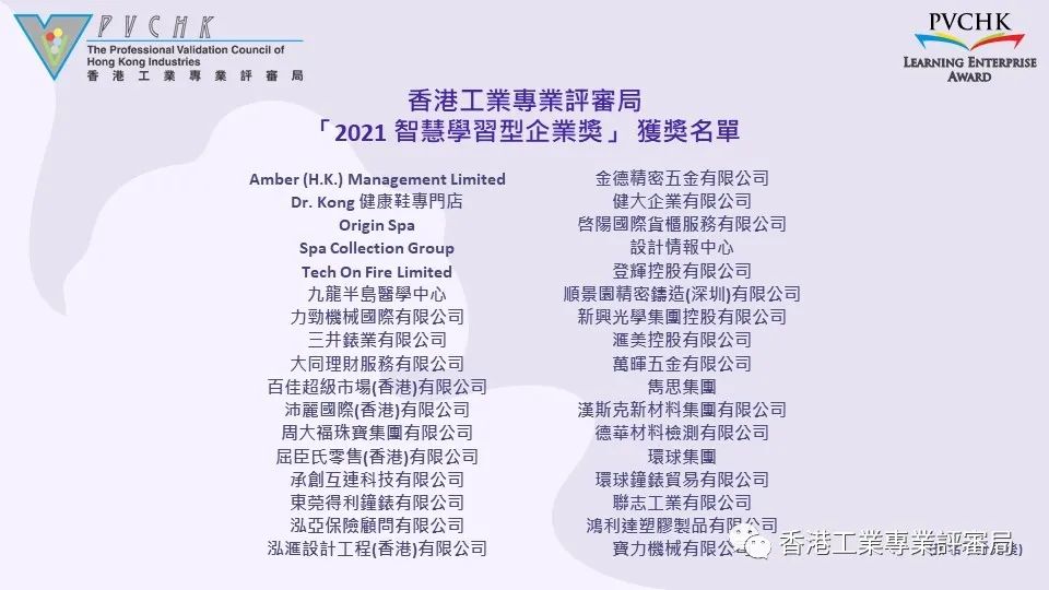 2015年,香港工業(yè)專業(yè)評審局創(chuàng)立了“智慧學(xué)習(xí)型企業(yè)獎”,獎項(xiàng)每兩年頒授一次,今年是第四屆評審。智慧學(xué)習(xí)型企業(yè)獎,旨在表揚(yáng)那些在推動學(xué)習(xí)文化中,建立學(xué)習(xí)體系,有效轉(zhuǎn)化并取得優(yōu)良成果的企業(yè)。