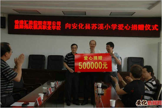 2012年,匯美實業(yè)向湖南安化清塘鋪鎮(zhèn)蘇溪村捐贈50萬元人民幣,用于修建偉欣教學樓。