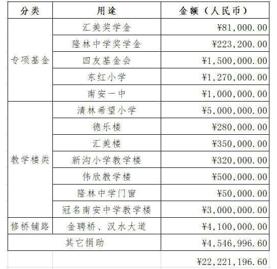 今天,給大家分享近些年來,匯美在社會層面做的一些善舉,主要從專項基金、教學樓類、修橋鋪路、其它捐助等四方面展開。
